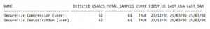 | select name, DETECTED_USAGES, TOTAL_SAMPLES, CURRENTLY_USED, FIRST_USAGE_DATE, LAST_USAGE_DATE, LAST_SAMPLE_DATE from dba_feature_usage_statistics where name in (‘SecureFile Compression (user)’, ‘SecureFile Deduplication (user)’); |